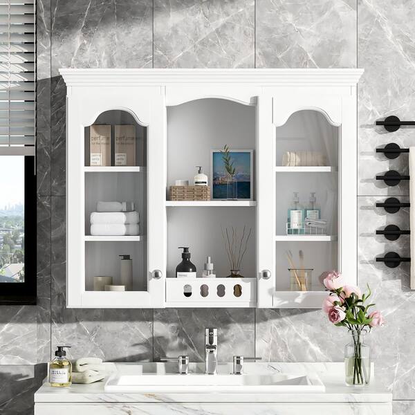 35.27 in. W x 28 in. H Rectangular Wall Wood Mounted Medicine Cabinet with Mirror and with 2-Glass Doors