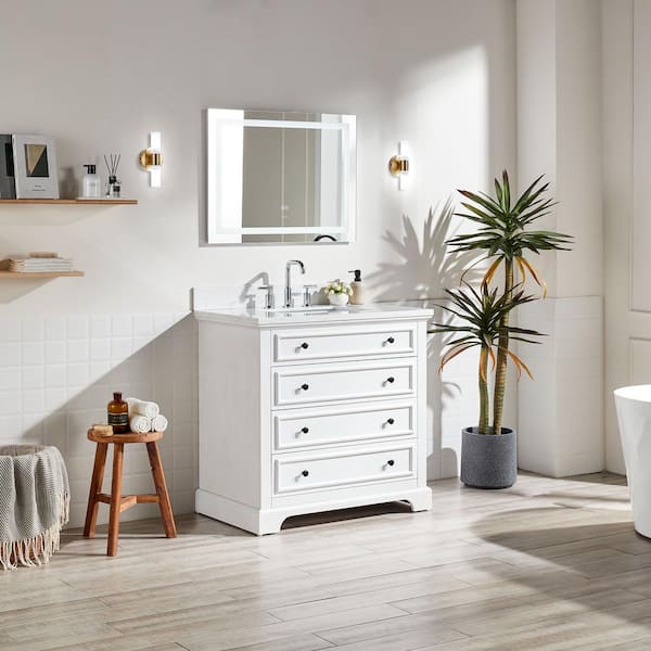 36 in. W x 22 in. D x 36 in. H Single Sink Solid Wood Bath Vanity in White with White Marble Top, Soft-Close