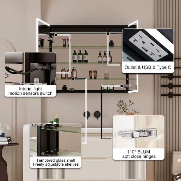 36 in. W x 30 in. H Rectangular Black Aluminum Recessed/Surface Mount LED Medicine Cabinet with Mirror,Outlet,Soft Close