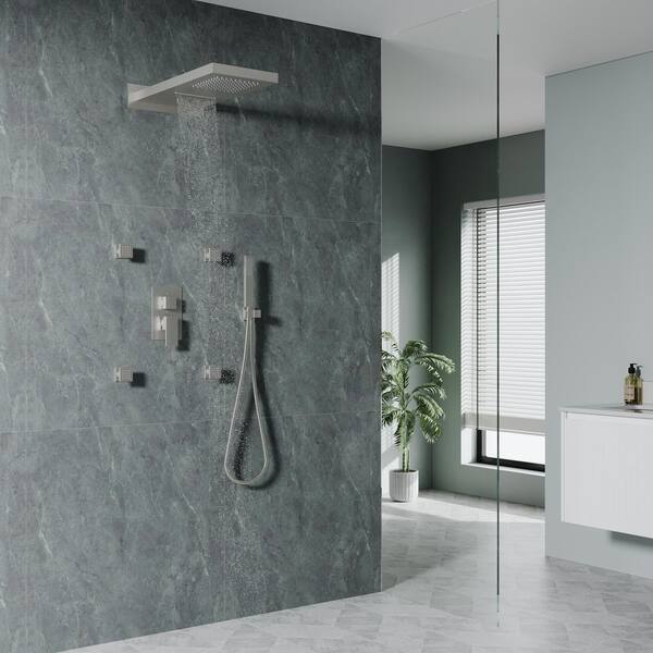 4-Jet Rectangular Wall Mount Shower System with With Handheld and Body Spray Thermostatic Massage Jets in Brushed Nickel