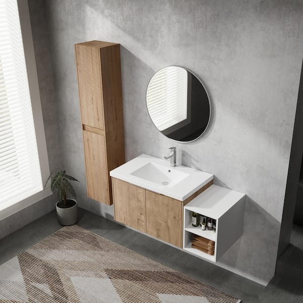 42 in. Single Sink Floating Imitative Oak Bath Vanity with White Resin Top, Open Shelf and Two Side Cabinets Unassembled