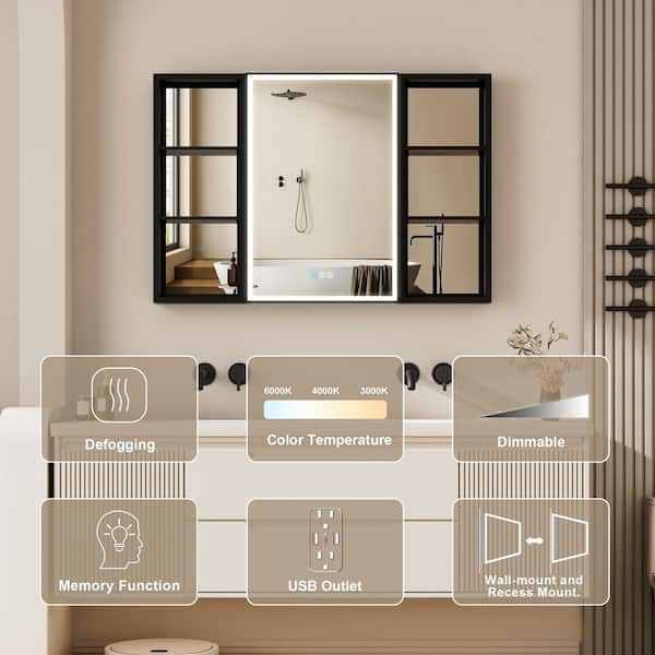 44 in. W x 30 in. H Rectangular Black Aluminum Recessed/Surface Mount LED Medicine Cabinet with Mirror and Outlet