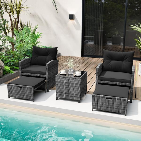 5-Piece Wicker Patio Conversation Set with 2 Ottomans and Black Cushions