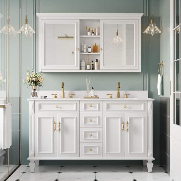 55 in. W x 30 in. H Rectangular Solid Wood White Medicine Cabinet with Mirror Surface Mount