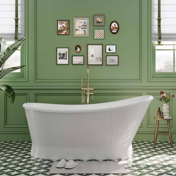 66 in. x 30 in. Acrylic Oval Flat Bottom Freestand Soaking Bathtub with Drain in Glossy White