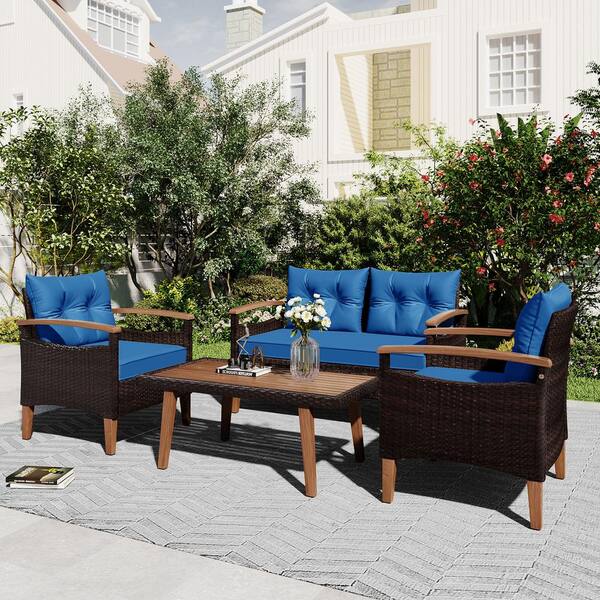 Brown 4-Piece Wicker Patio Conversation Set with Blue Cushions and Wood Table