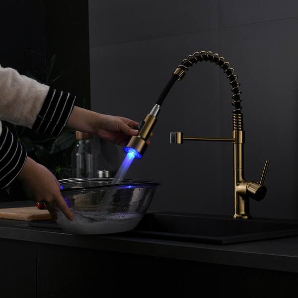 Led Single Handle Pull Down Sprayer Kitchen Faucet in Gold