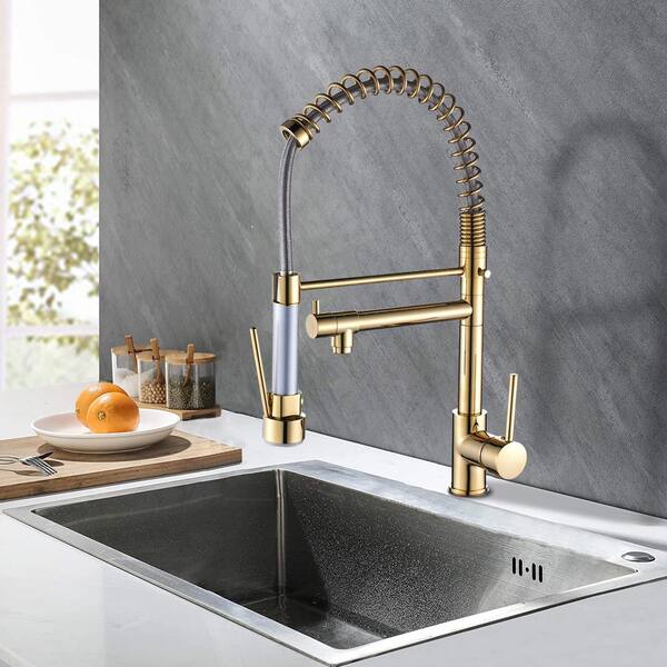 Single Handle Pull Down Sprayer Kitchen Faucet with 2-Spouts in Polished Gold