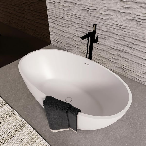 Stone Flat Bottom Solid Surface Freestanding Soaking Bathtub in White with Drain 55 in. x 31 in.