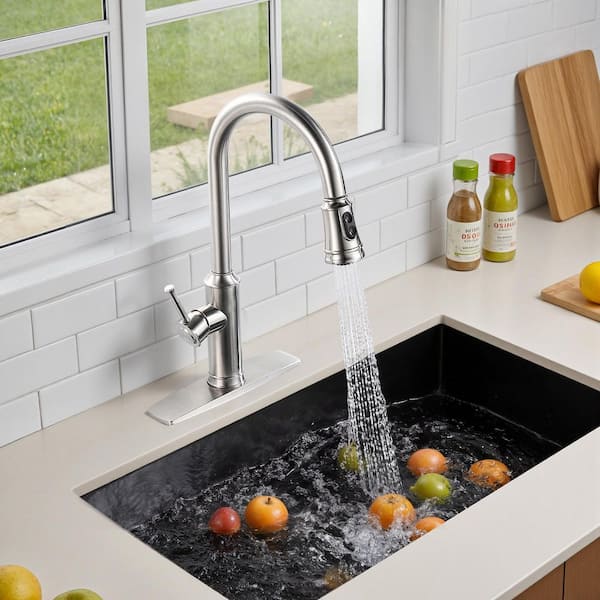 High Arc Single Handle Kitchen Faucet with Pull Down Sprayer in Brushed Nickel