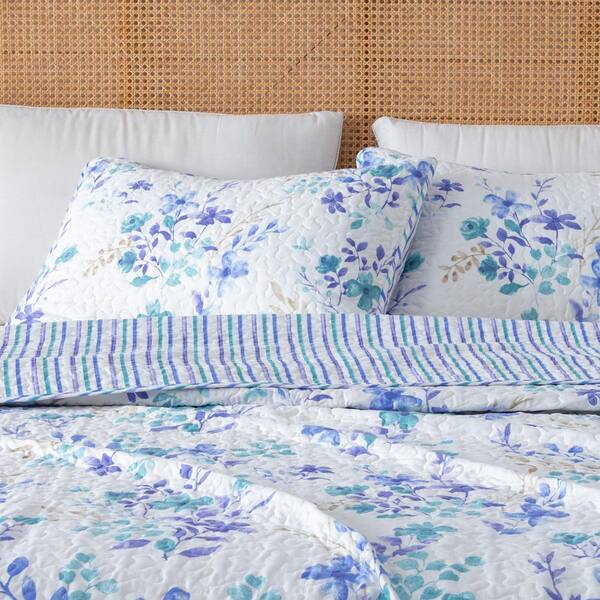 Blue Floral Printed Reversible Microfiber Quilt Set (2-or 3-Piece)