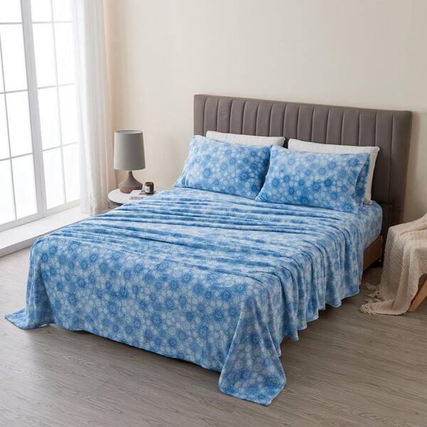 Blue Printed Velvet Plush Polyester Ultra Soft King Bed Sheet Set