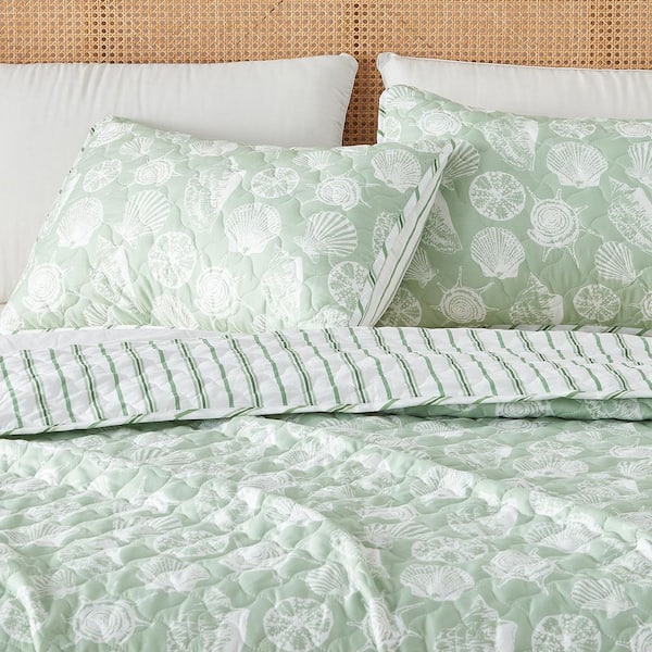 Green Simple Seashell Coastal Microfiber Quilt Set (2-or 3-Piece)