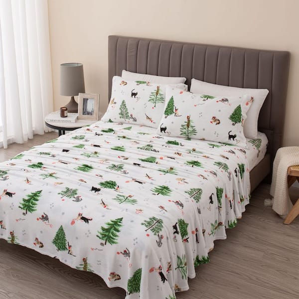 Winter Cats Printed Velvet Plush Polyester Ultra Soft Queen Bed Sheet Set