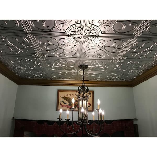 Lilies and Swirls Silver 2 ft. x 2 ft. PVC Lay-in or Glue-up Faux Tin Ceiling Tile (40 sq. ft. /Case)