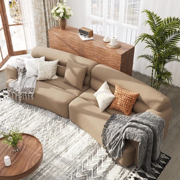 110 in. Round Arm Polyester Flannel Curved Sofa with Rebound Cushions in Camel Brown