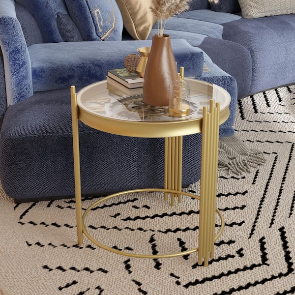 18.5 in. W Round Clock-Inspired Metal Indoor Side Table With Glass Top, Elegant Gear Mechanism and Gold Trim