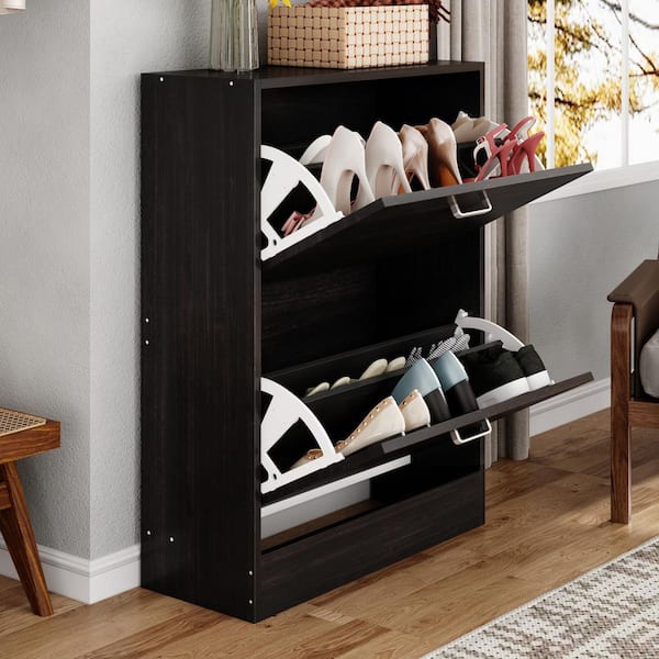 22.4 in. W x 28.9 in. H 12-Pair Black Wood 2-Drawer Shoe Storage Cabinet with Foldable Compartments