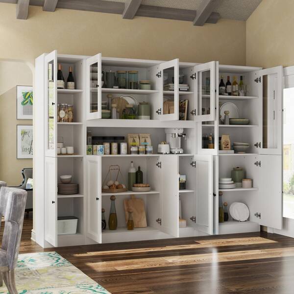 3-in-1 White Wood Buffet and Hutch Combination Storage Cabinet with Tempered Glass Doors (94.5 in. W x 70.9 in. H)