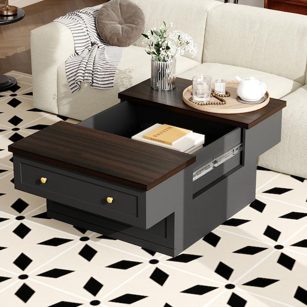 31.5 in. Gray Square Wood Coffee Table with Sliding Walnut Top, Hidden Storage, 2-Drawers, Mid-Century Vintage Style
