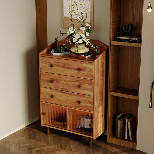 31.5 in. Length Yellow Wood Grain Rectangle Wood Console Table, Sideboard with 3-Drawer, 2-Shelf, Sliding Glass Doors