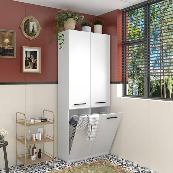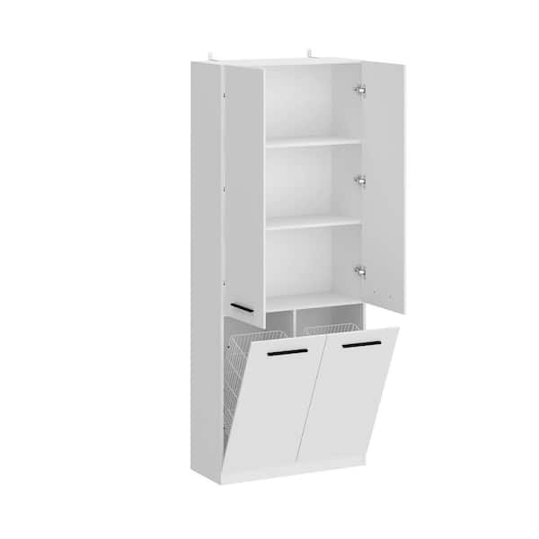 31.5 in. W x 13.7 in. D x 78.7 in. H White Freestanding Bathroom Linen Cabinet with 2-Flip Laundry Hamper for Clothes