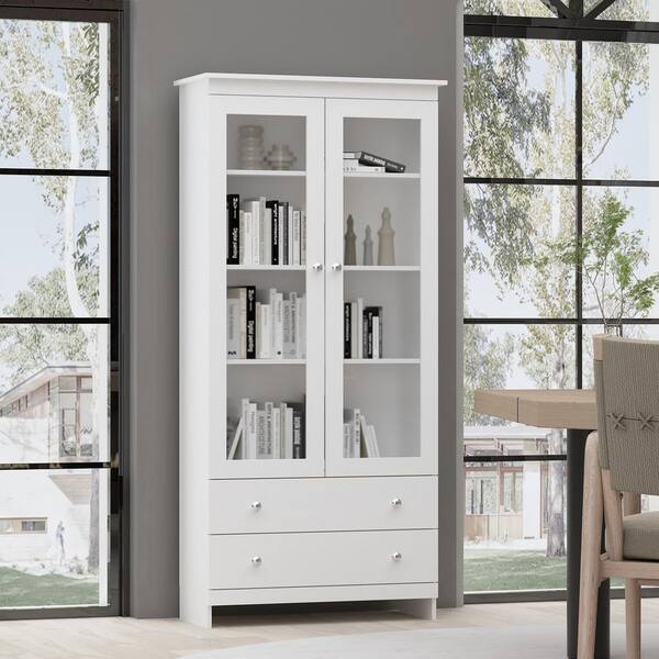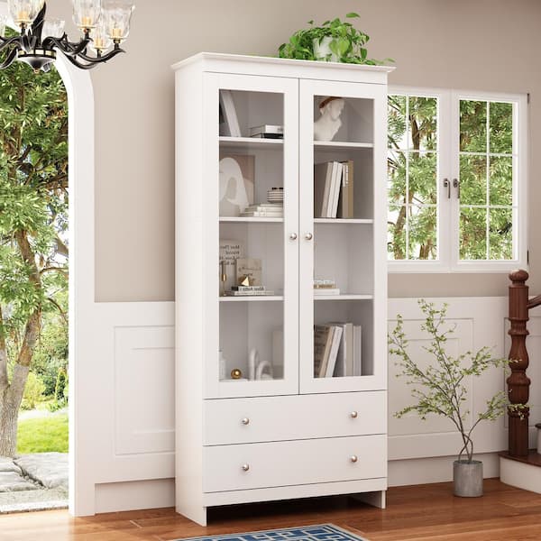 33.1 in. W x 70.7 in. H White Wood 4-Tier Shelves Standard Bookcase Bookshelf With Drawers , Adjustable Shelves