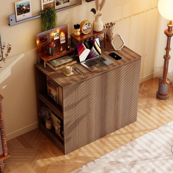 33.5 in. W Rectangle Brown Wood Grain Wooden 3-Drawer Computer Desk with 4-Shelf & Extendable Top Storage Space