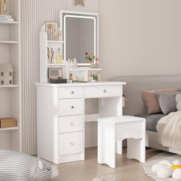 5-Drawers White Makeup Vanity Sets Dressing Table Sets With Stool, LED Lighted Mirror, Power Strip and Hair Dryer Holder