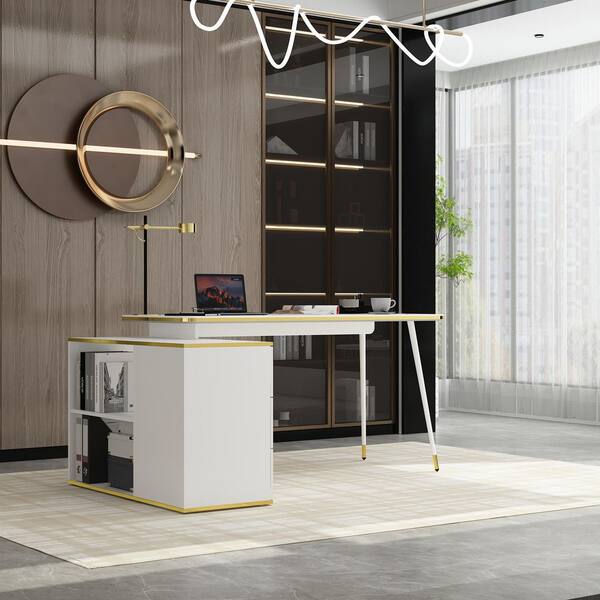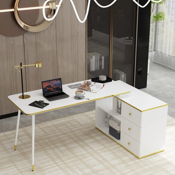 55.1 in. Width L-Shaped White & Golden Wooden 3-Drawer Computer Desk, Writing Desk with 2 Open Shelves