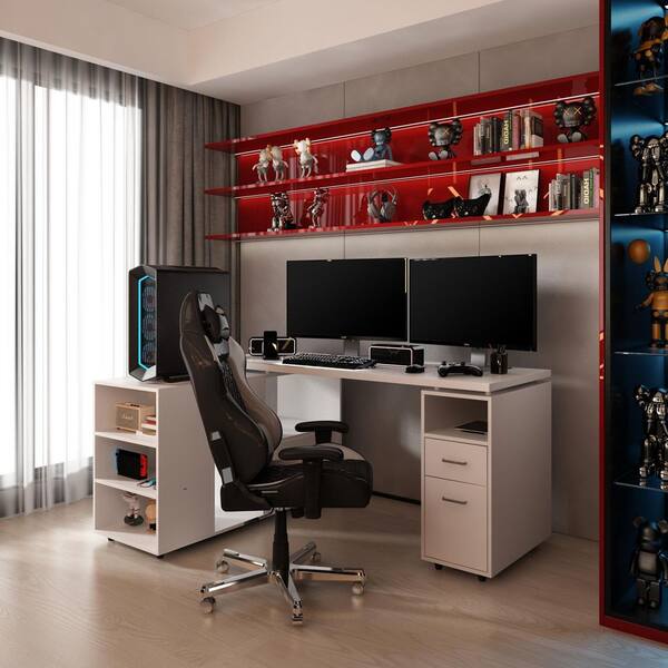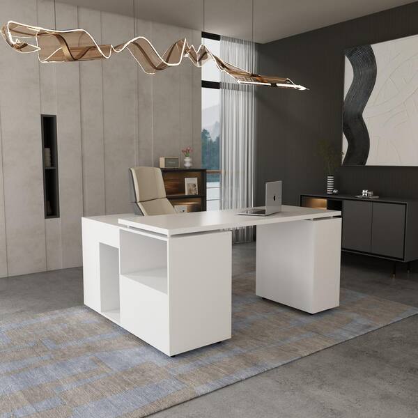59 in. L-Shaped White Reversible Wood Computer Desk Office Home Working Writing Desk with Cabinet, Drawers and Shelves