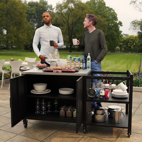 60.8 in. Outdoor Kitchen Grill Cart with Stainless Steel Top-Mobile Natural Gas Grill Island in Black, Storage Shelves