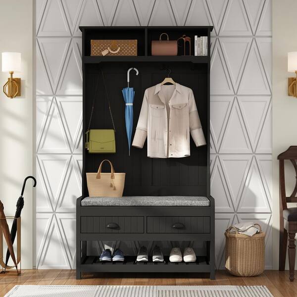 68.5 in. Black Wood 3-in-1 Coat Rack with 4-Metal Hooks and 2-Drawers, Storage Bench