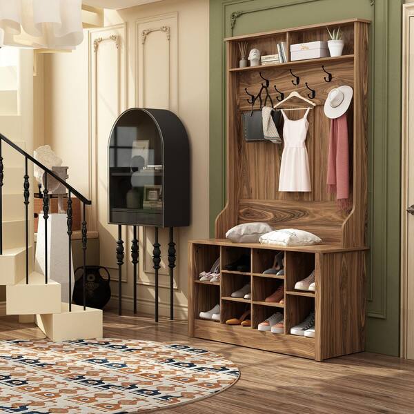 68.5 in. H Brown Wood 3-in-1 Freestanding Coat Rack Shoe Storage with 7-Metal Double Hooks and Bench
