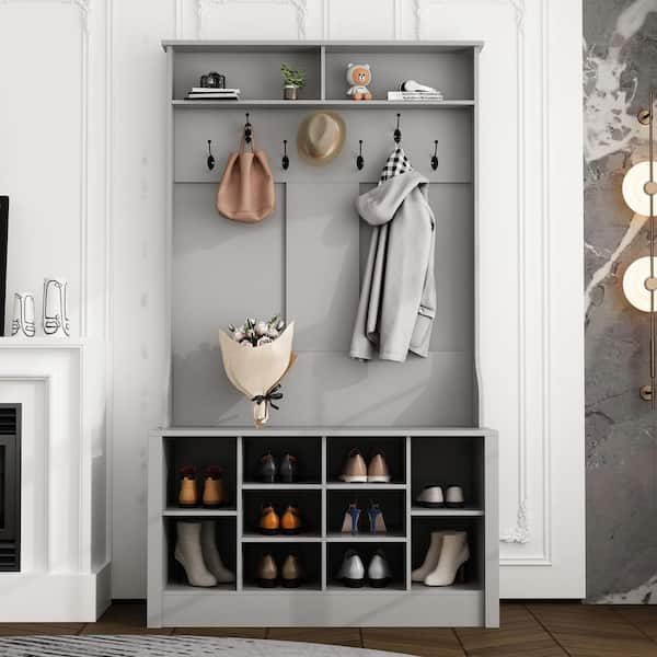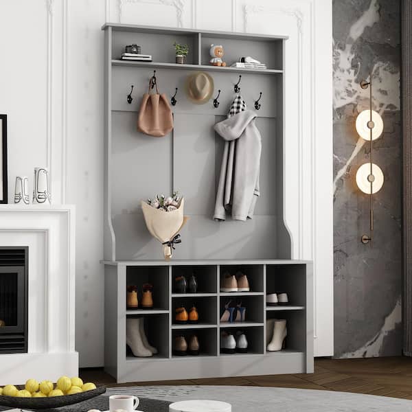 68.5 in. H Gray Wood 3-in-1 Freestanding Coat Rack Shoe Storage with 7-Metal Double Hooks and Bench