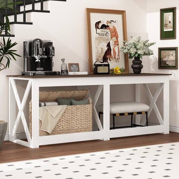 83.9 in. W Walnut and White Rectangle Wooden No Drawer Computer Desk, Writing Desk with Long Table Top