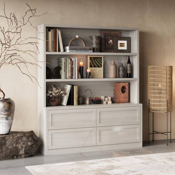Beige Wood Grain Wood 63 in. W Sideboard Bookcase Storage Cabinet with 4 Drawers and 3 Open Shelves