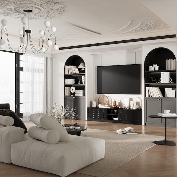 Black TV Stand Entertainment Center Fits TV's up to 85 in. with 6 Shelves, 4 Press Type Doors
