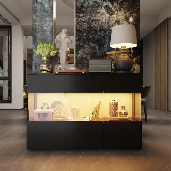 Black Wood 32.1 in. H Accent Cabinet Office Storage Cabinet with 9-Shelves and Tempered Glass Doors, 3-Color LED Lights