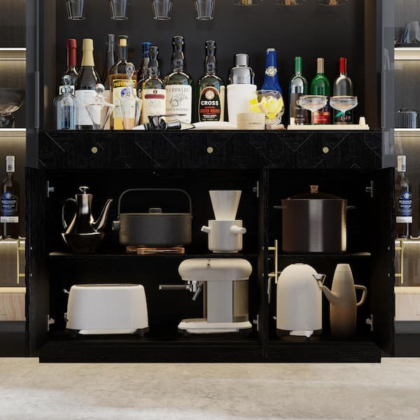 Black Wood 47.2 in. W Sideboard Buffet Cabinet with 3-Drawers, Adjustable Shelves and Gold Handles, Geometric Design
