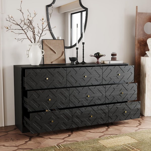 Black Wood Embossed 9-Drawer 63 in. Chest of Drawers with Gold Button Pulls for Bedroom, Living Room or Entryway