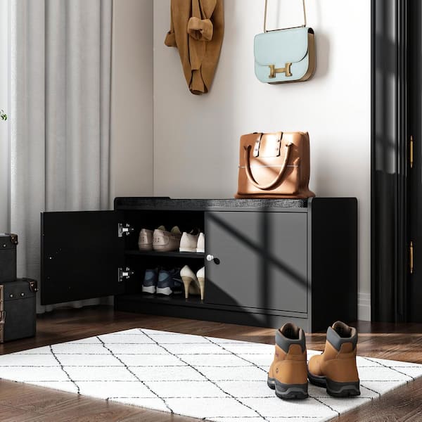 Black Wood Shoe Storage Bench Max 8-Pair Shoes with 2 Doors and Adjustable Shelves, 35.8 in. W x 18.1 in. H