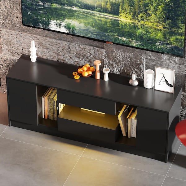 Black Wooden TV Stand, Entertainment Center Fits TV's up to 70 in. with 2-Drawer, 2-Doors and Open Shelves