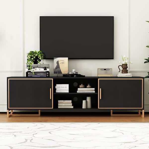 Black and Golden TV Stand Entertainment Center Fits TV's up to 70 in. with 6-Shelves and 2-Doors