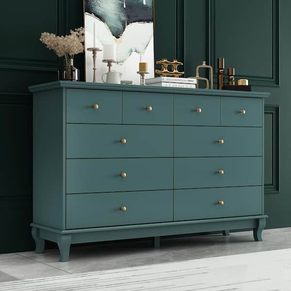 Blue 10-Drawers 55.1 in. W Wood Chest of Drawer Cupboard Sideboard with Paint Finish, 35.4 in. H x 15.7 in. D