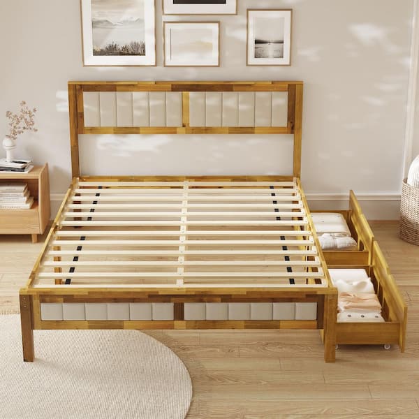 Brown Acacia Wood Frame Queen Panel Bed with Underbed Storage Drawers