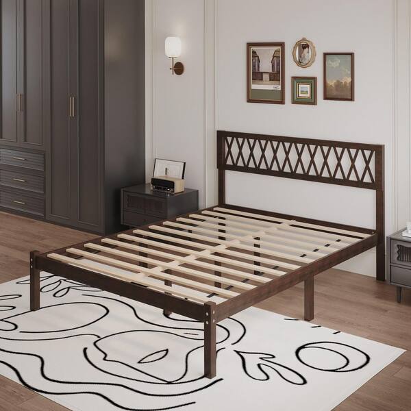 Brown Walnut Solid Wood Oak Flatbed Frame Queen Size Panel Bed with Grid Patterned Headboard