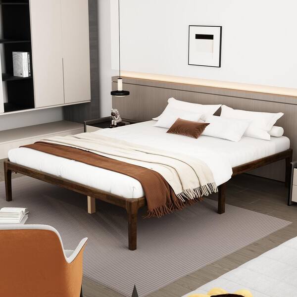 Brown Walnut Wood Grain Rubber Wood and Pine Wood Frame Queen Size Platform Bed with 9-Legs