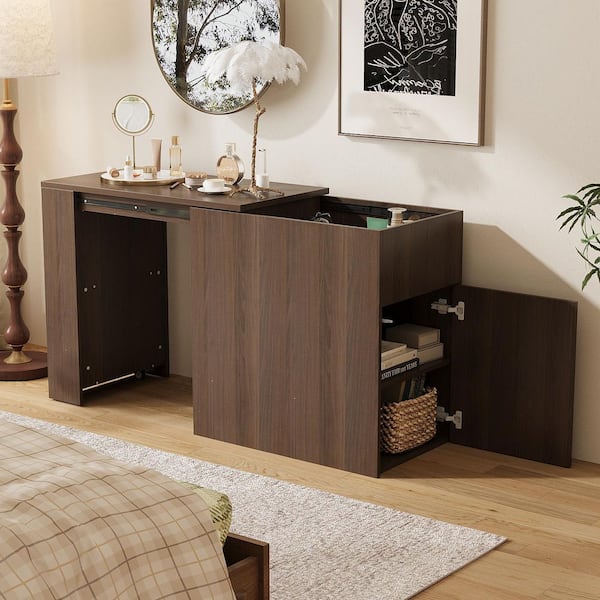 Brown Wood Grain 2-Drawer 33.5 in. W Dresser, Vanity Table without Mirror, with 4-Shelf and Extendable Top Storage Space