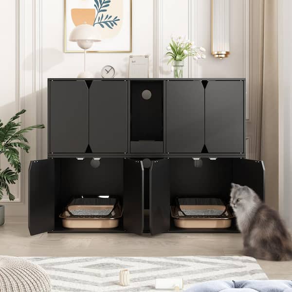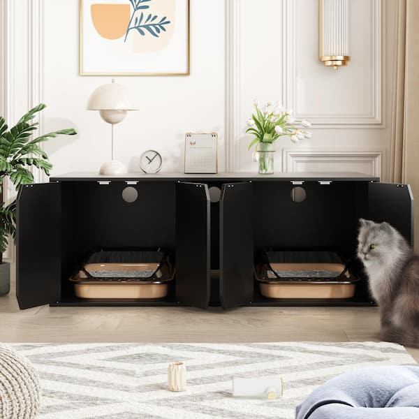 Cat House Furniture for 2 Cats, Large Modern Wooden 4-Door Cat Washroom with Double Room and Litter Catch, Black